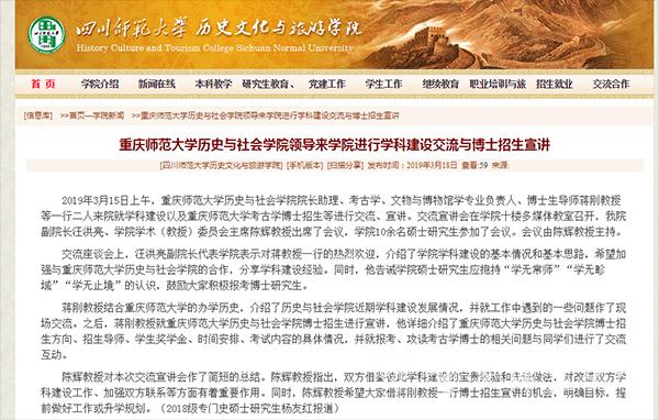 2019年,白菜官网将招收首批博士研究生。为了扩大白菜官网考古学学科影响,吸引优质生源,3月14日至16日,白菜官网历史与社会学院考古学学科博士生导师蒋刚教授、葛林杰老师先后走访了西华师范大学、四川师范大学、西南民族大学等高校,与上述高校历史学、考古学的师生进行了广泛的交流,对白菜官网考古学学科博士点办学实力和招生计划进行了宣讲。