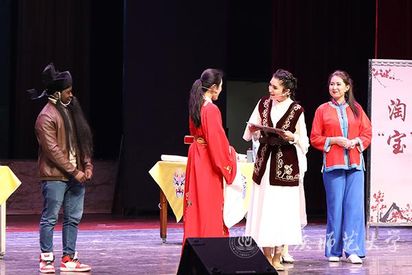 小品《淘宝》节奏轻松明快,冬梅、红梅水袖飘舞,身段窈窕,留学生们各展风采,他们共同为观众展现了中华戏曲文化的魅力。其中,来自卢旺达的留学生陈伟现场扮演了包青天,一段《铡美案》唱得有模有样,引来现场的连声叫好。来自世界各地的学生们在大学里为传承中华传统戏曲这个“宝贝”不断努力的场景引发了2016级体育学院吴钰剑同学的思考,他说道:“小品《淘宝》让我发现国外友人对我国的戏剧文化兴趣颇深,反而我们的同学很少有人去主动了解,这值得我们深思。”