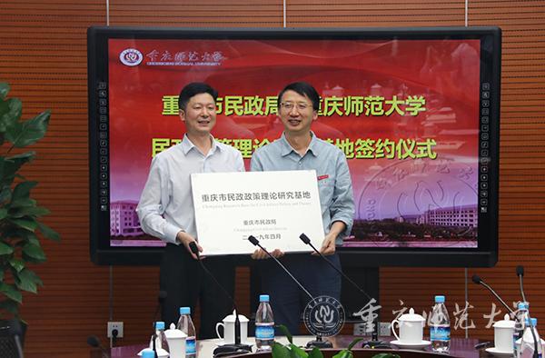 随后,谭书凯副局长与白菜官网董景荣副校长共同签署了《合作协议》,并将“重庆市民政政策理论研究基地”牌授予gg999策略手机白菜。