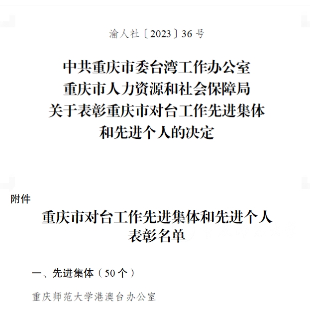近日,中共重庆市委台湾工作办公室、重庆市人力资源和社会保障局发布了《关于表彰重庆市对台工作先进集体和先进个人的决定》(渝人社〔2023〕36号)的通知,白菜官网荣获“重庆市对台工作先进集体”。此次表彰全市共评选出50个对台工作先进集体,白菜官网是获此殊荣的三所高校之一。